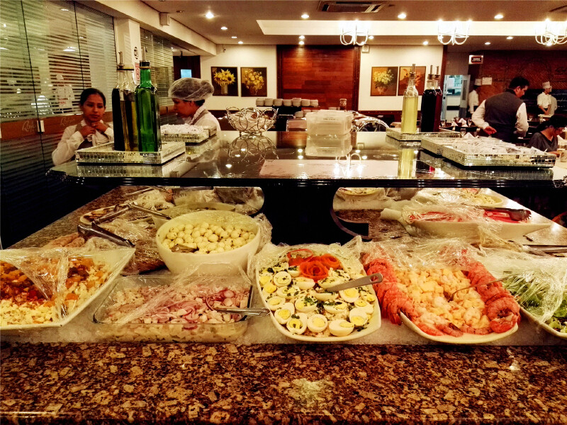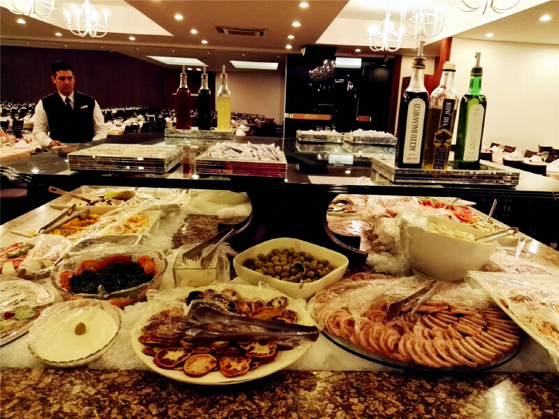 从瀑布出来,大家都觉得不尽兴,甚至有人提出再返回走一趟,当然这只是表明伊瓜苏瀑布的确很令人流连忘返。晚上到了小张建议的一家当地自助烤肉餐厅,自助餐的确不错,而且不贵,还有巴西风格的桑巴舞表演。看表演的位子稍贵一些,我们不需要看,只要吃好。这次出来几乎都没有按时吃饭,看到丰富的餐食,我们心想今天一定要胡吃海塞一回了,没想到刚吃了一小盘就感到有些饱了,真没出息。
