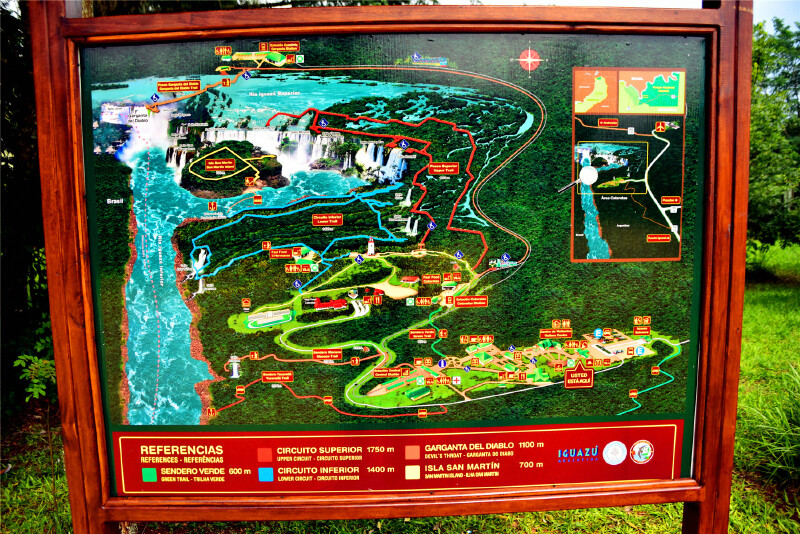 这张游览图标明了景区内红线、蓝线和观光火车的游览线路。还有一条黄线是在圣马丁岛上的,走这条线要先坐冲锋艇上到岛上才能实现,所以选择这条线路的游客不多。另外,我们可以从这张图上看到伊瓜苏河中间的那条虚线就是阿根廷和巴西的国界线,很明显伊瓜苏瀑布的绝大部分都被划在阿根廷境内。