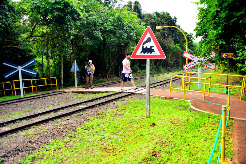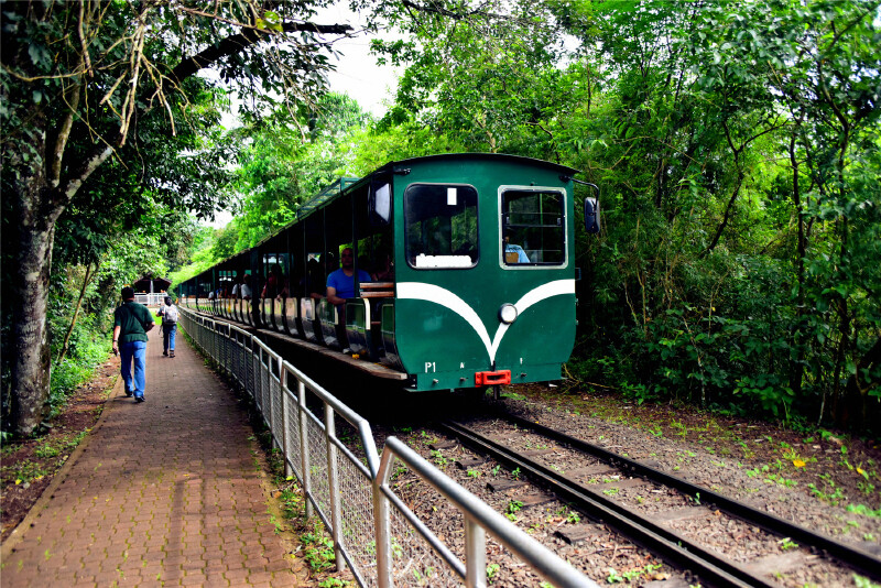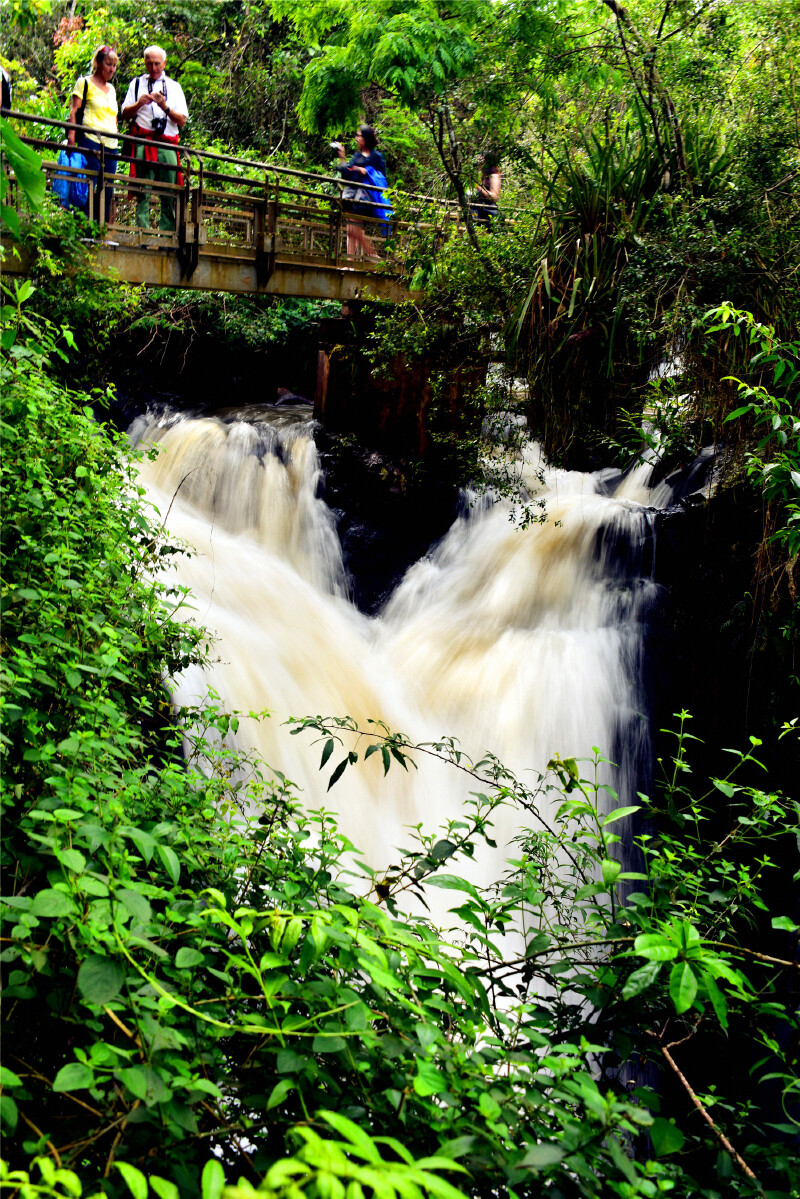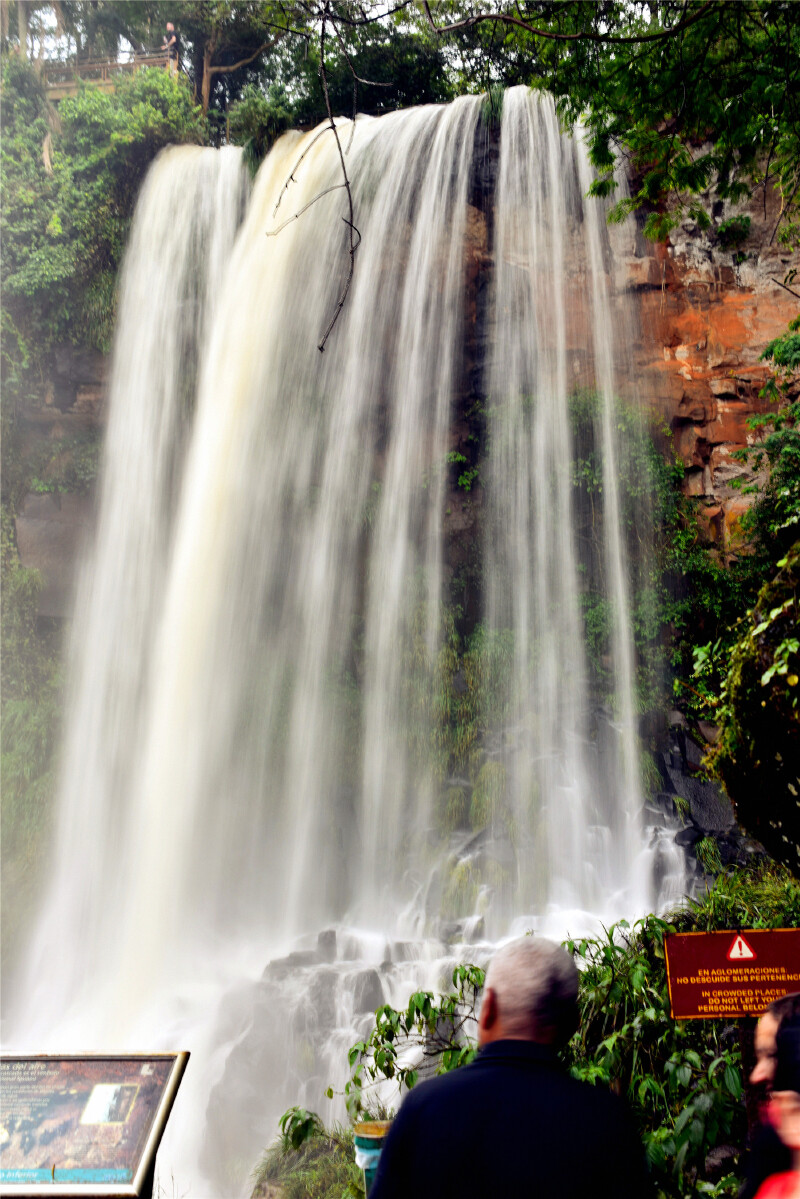 到瀑布后,赶紧买票进入景区。阿根廷一侧参观伊瓜苏瀑布有三条线路可走。一是红色线路,游人可通过一条长3000多米的蜿蜒小桥抵达瀑布边缘,在瀑布上方俯视,站在木制栈桥上,俯视伊瓜苏河注入峡谷的壮观景象;二是蓝色线路,沿公园的小径往里走,两边都是郁郁葱葱的热带丛林,栈道蜿蜒贯穿在密林之中,可说是10步一景,走到小径尽头,就到了“魔鬼咽喉”的脚下,可看到几十米宽的瀑布,河水是黄色的,有如千军万马轰然而下,巨大的水流冲击在岩石上,翻腾咆哮,水汽弥漫,这条线路的精彩在于可以直抵“魔鬼咽喉”;第三条是免费乘坐公园里的观光火车抵达位置最远的瀑布上方领略瀑布自上而下一泻千里的百态景观。因为留给我们的只有两个多小时的游览时间,我们只能选择蓝色线路直扑“魔鬼咽喉”。