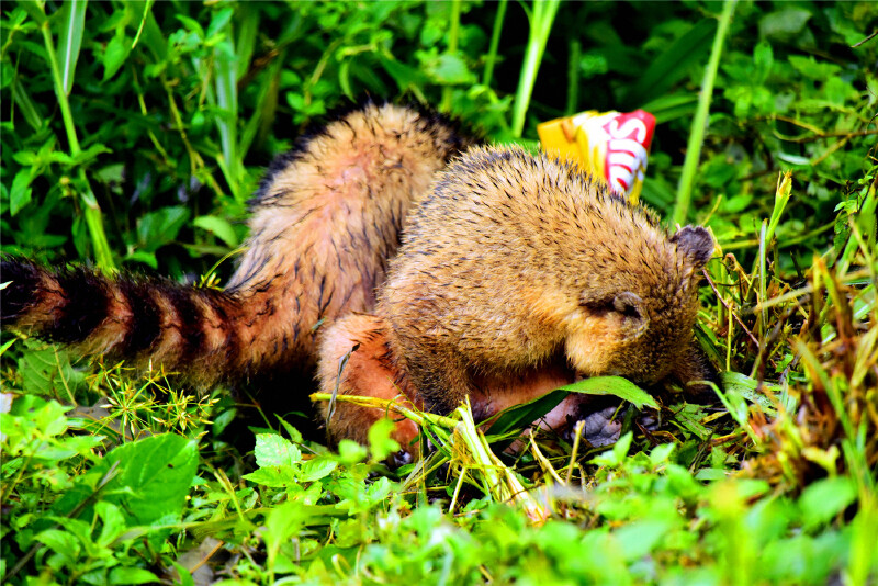 再仔细一看,这种动物嘴尖尖的,尾巴是带环状花尾巴。后来查了资料,才知道这就是“果子狸”。国人常把它当成野味,多年前的那场“非典”也是因它而起。