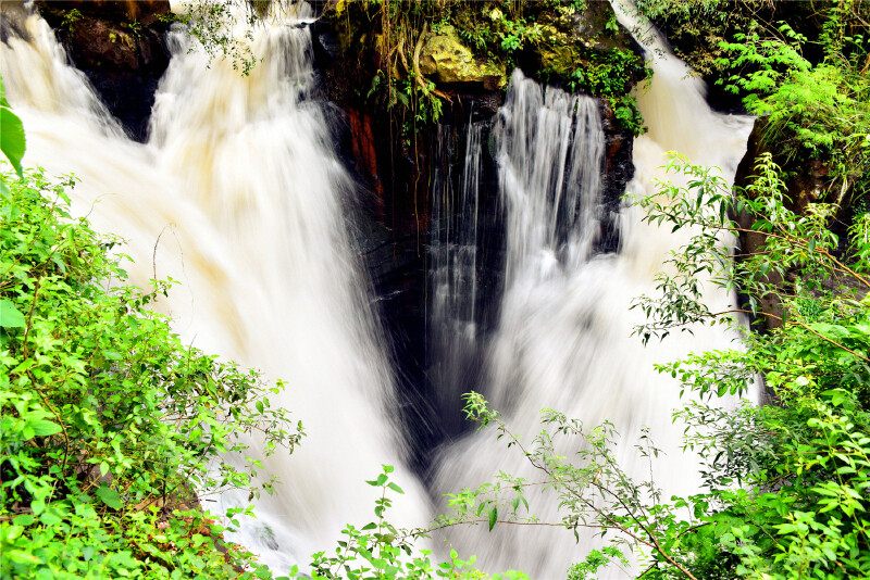 穿过一片茂密的森林,前方传来巨大的轰鸣声,隔着树林只见那里水雾腾空而起,瀑布应该就在那里了。