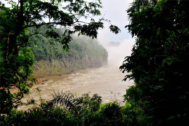 奔腾的伊瓜苏河水带着巨大的轰鸣声冲下断崖。