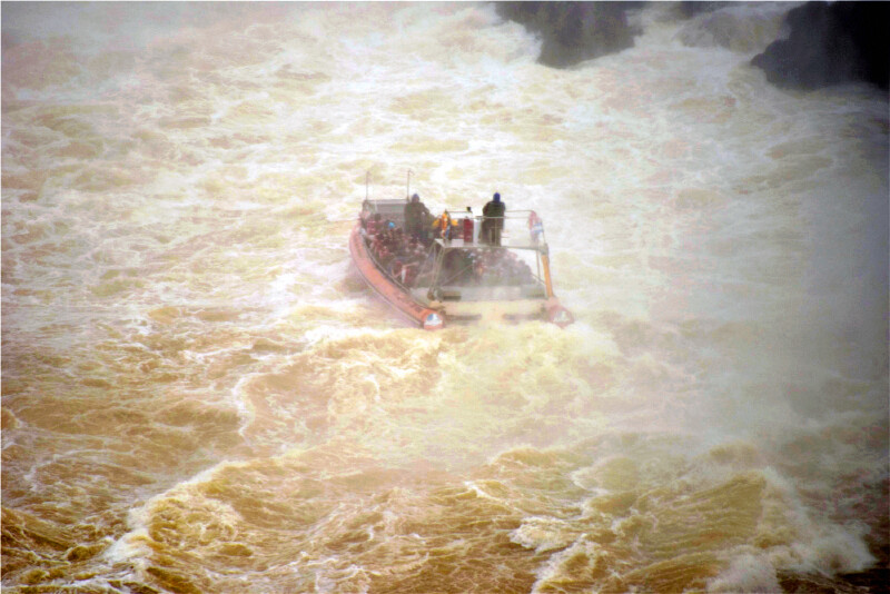 这时我们惊奇第看到一叶扁舟在翻滚的伊瓜苏河里,跌跌撞撞第向瀑布冲过去。
