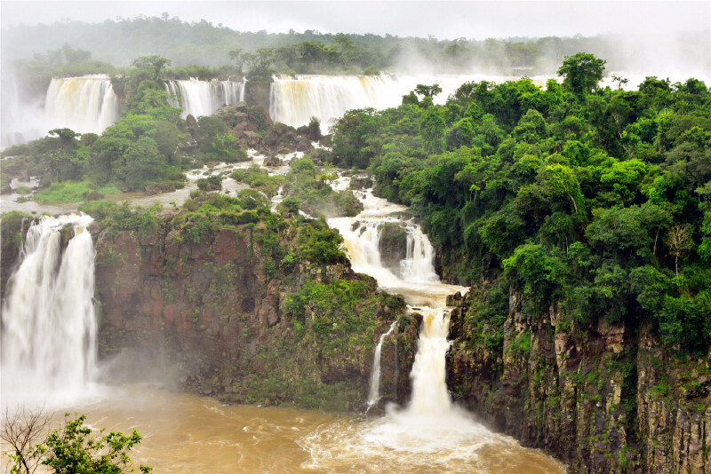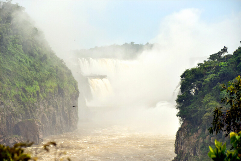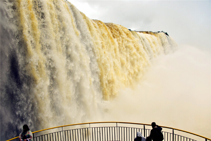 “魔鬼咽喉”由三个瀑布群组成,由于在丰水期,现在的瀑布流量就已经达到每秒五千多立方。水流太大导致河水携裹着泥沙而呈现黄色,如在枯水季节,伊瓜苏河的河水是清澈洁白的。如果水流量超过每秒一万立方,为保证游客的安全,通往“魔鬼咽喉”的这条游览通道则将被关闭。