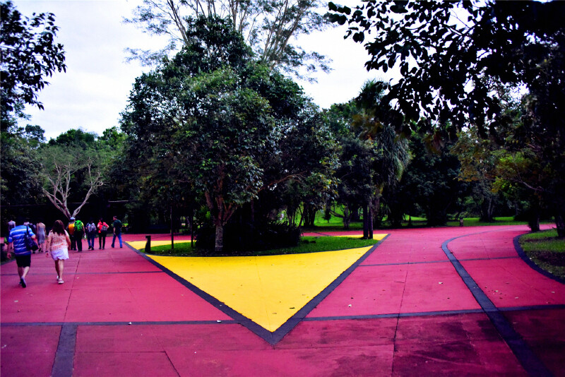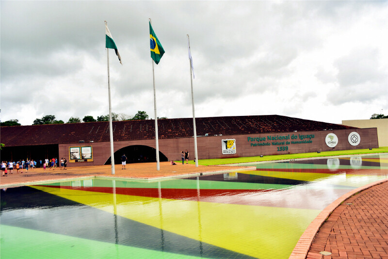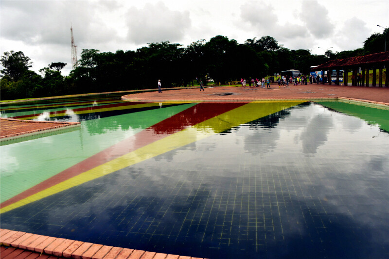 巴西伊瓜苏瀑布公园大门前广场有一个宽阔的水池,池底用彩色花砖铺就,使得水面五彩缤纷,吸引了人们的眼球,成为了一道风景。