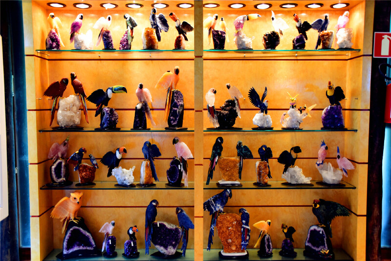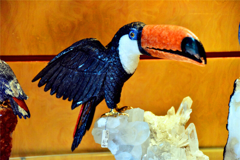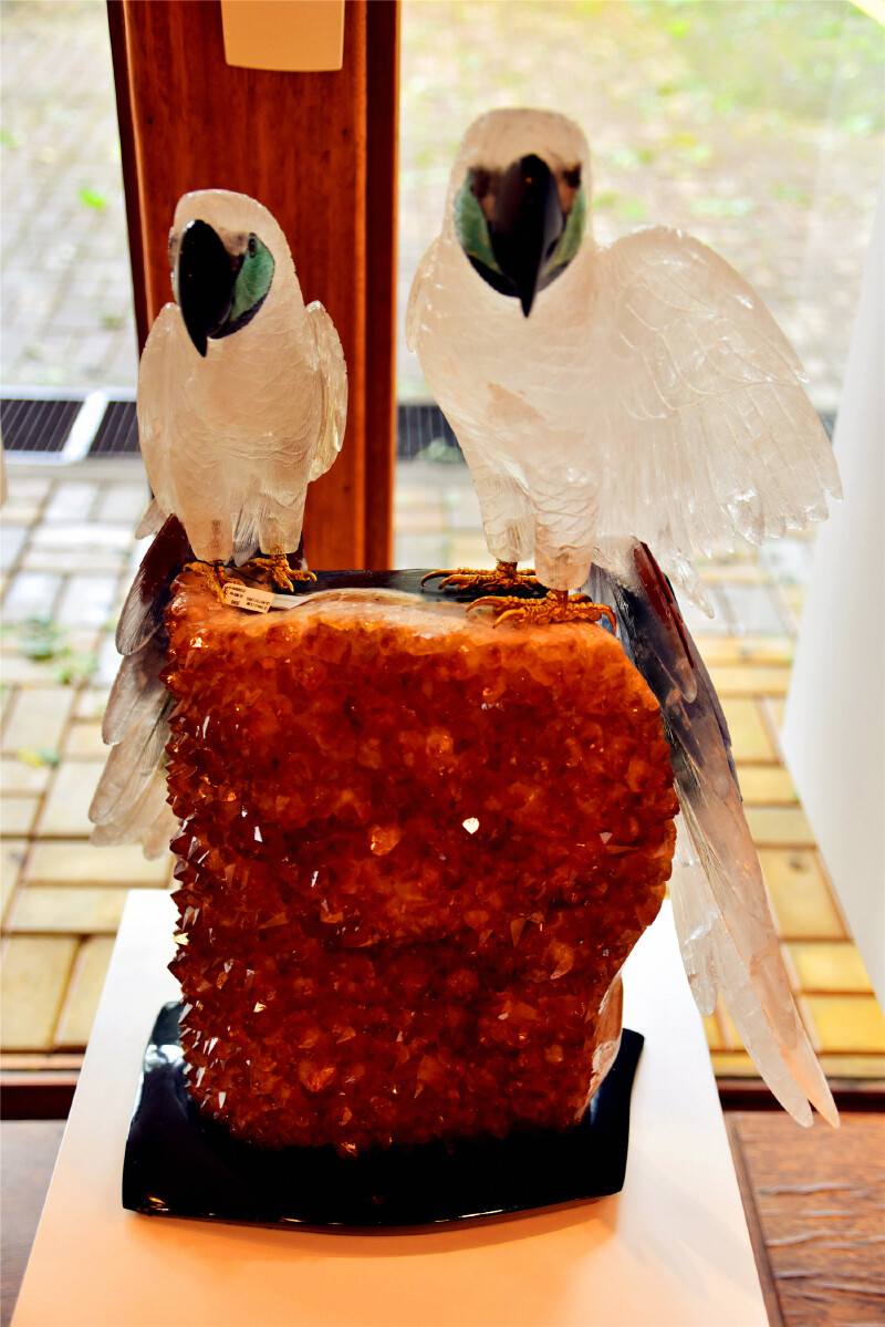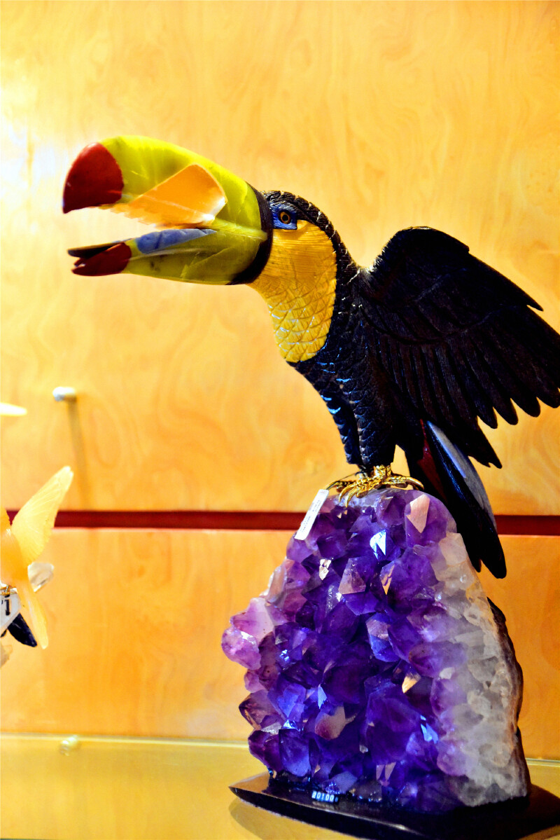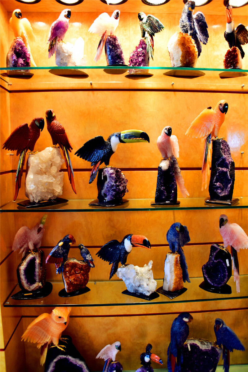 这些用当地各种宝石雕刻的热带鸟雀色彩艳丽,形象逼真。